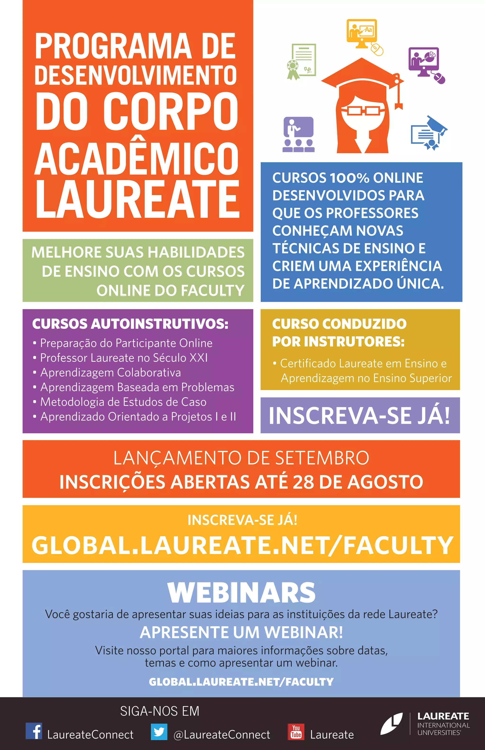 O documento anuncia cursos online gratuitos em setembro para professores melhorarem suas habilidades de ensino, incluindo preparação de participantes, aprendizagem baseada em problemas e estudos de caso. Os cursos são autoinstrutivos ou conduzidos por instrutores e fornecem um certificado. Também convida professores a apresentarem webinars.