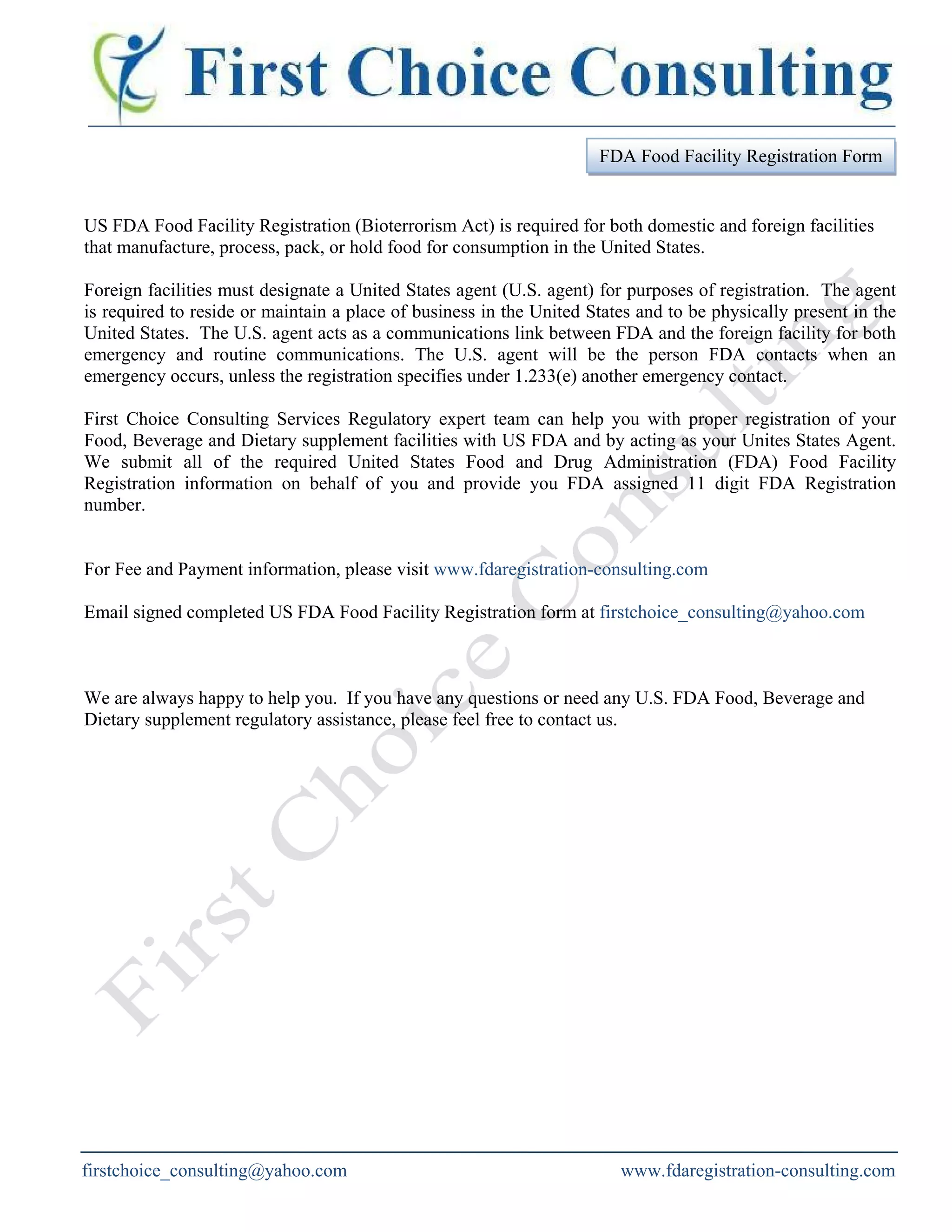 The document outlines the requirements for food facility registration with the US FDA under the Bioterrorism Act for both domestic and foreign facilities. It explains the need for foreign facilities to designate a US agent, details the registration process, and provides a food facility registration form. The document also offers consulting services to assist with FDA registration and compliance for various types of food businesses.