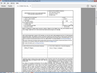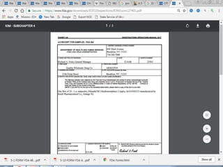 The document defines FDA warning letters and describes the process of FDA inspections that can lead to warning letters. It explains that warning letters notify companies of violations found during inspections and investigations. Companies must promptly correct issues and FDA will check that corrections are adequate. The document also describes different types of warning letters for various regulated industries and how to browse existing warning letters on the FDA website.