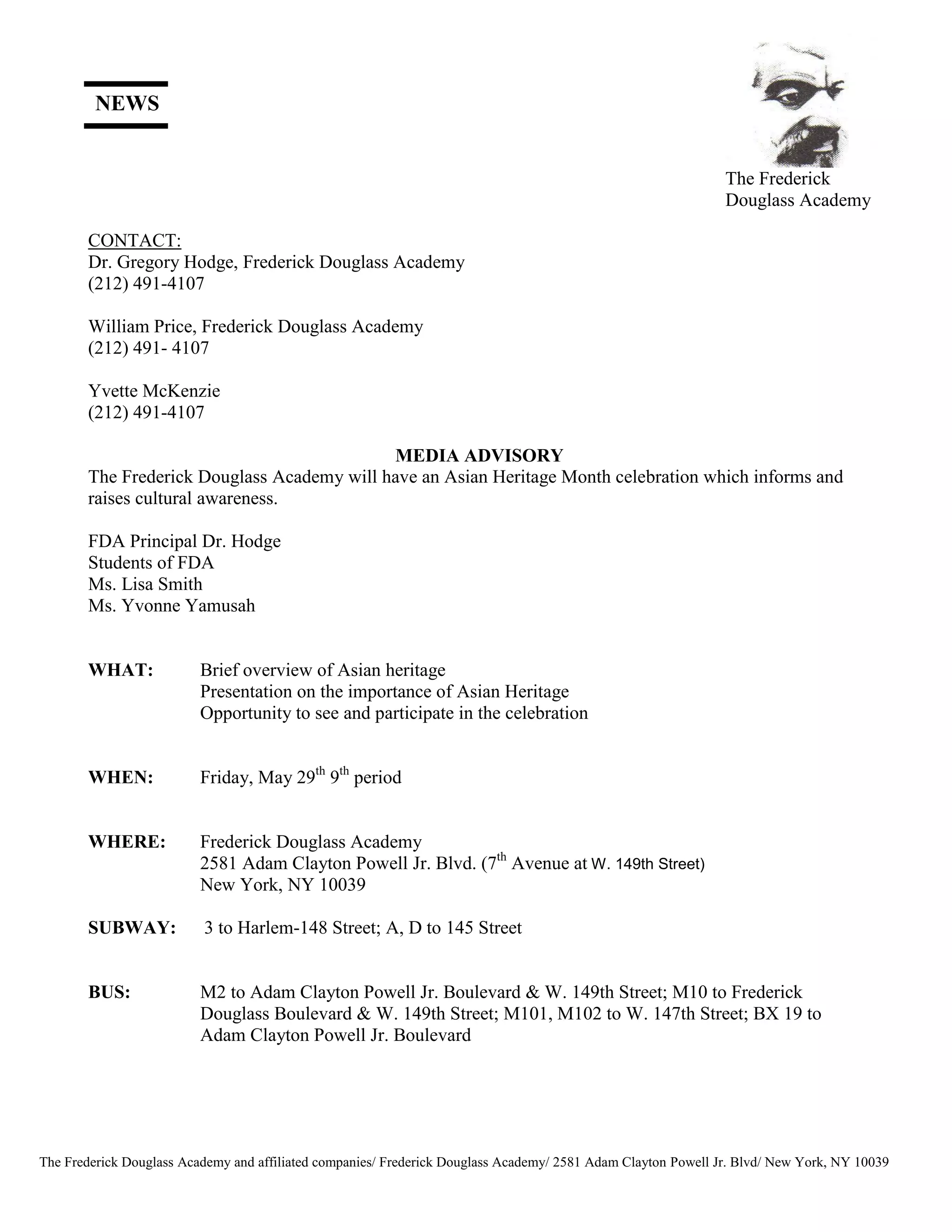The Frederick Douglass Academy will host an Asian Heritage Month celebration on Friday, May 29th during the 9th period. The event will include a brief overview of Asian heritage and a presentation on the importance of Asian Heritage. Students and staff will have an opportunity to participate in celebration activities and learn about Asian culture. The celebration will take place at the Frederick Douglass Academy located at 2581 Adam Clayton Powell Jr. Blvd in New York City.