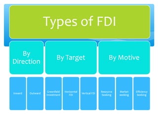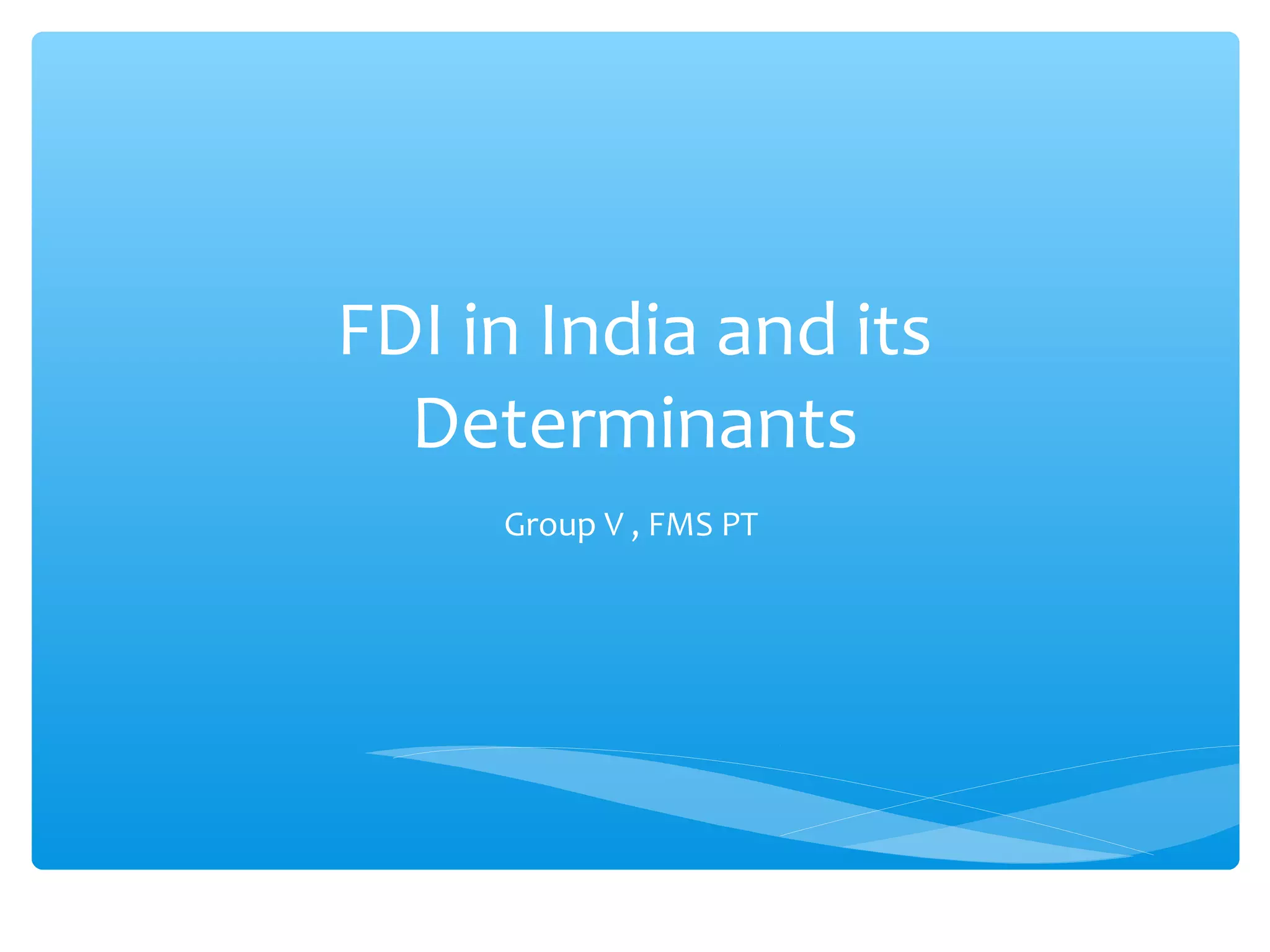 The document discusses factors that determine foreign direct investment (FDI) in India, including income, exchange rates, technology, human capital, and openness of the economy. It hypothesizes that FDI is a function of these country-specific factors. The methodology section outlines a model for FDI as a function of these variables. Trend analyses show some correlation between FDI and GDP and limited correlation with exchange rates. The conclusion emphasizes that the growth, size, and openness of the Indian economy as well as currency exchange rates are important determinants of FDI inflows.