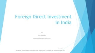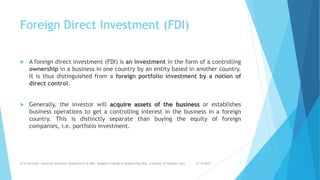 The document discusses foreign direct investment (FDI) in India. It defines FDI and describes the three main types. It outlines government initiatives to increase FDI, including liberalizing policies and launching the "Make in India" campaign. It discusses the automatic and government routes for FDI. Key sectors that attract FDI are also examined, such as infrastructure, automotive, pharmaceuticals, services, railways, chemicals, textiles, and airlines.