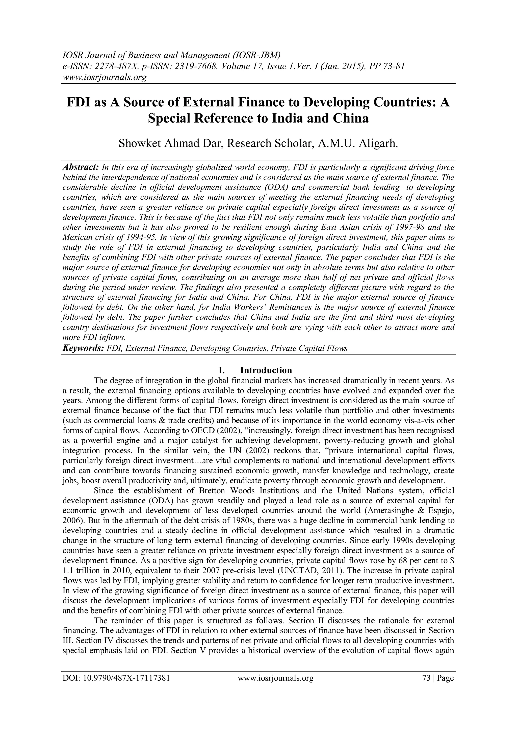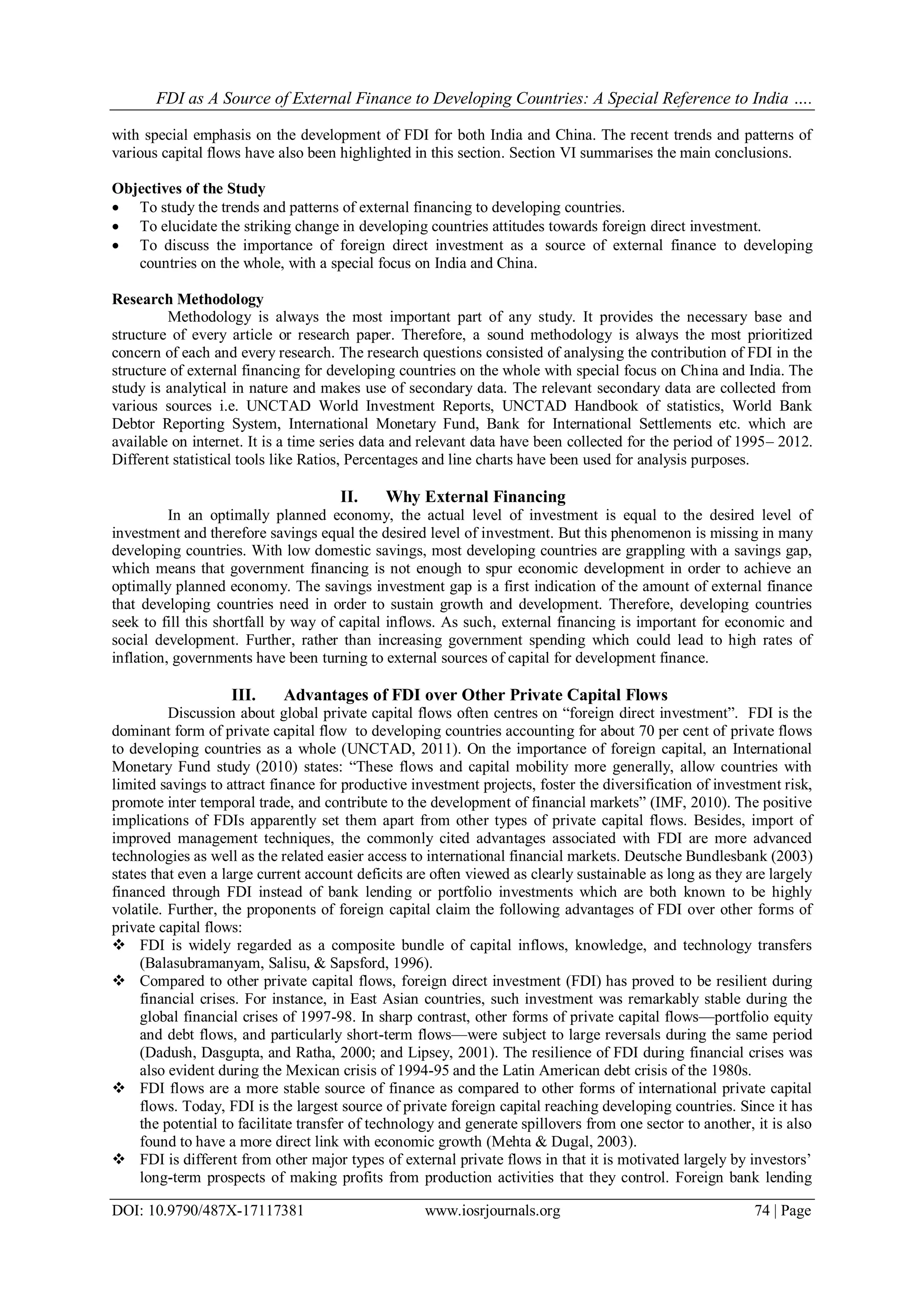 The document discusses the significance of foreign direct investment (FDI) as a primary source of external finance for developing countries, particularly India and China. It highlights the decline in official development assistance and commercial bank lending, leading to increased reliance on FDI, which is noted for its stability and potential to support long-term economic growth. The paper concludes that while China primarily depends on FDI and debt for financing, India relies on workers' remittances, demonstrating the contrasting external financing structures of the two countries.
