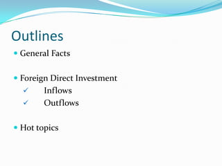 This document provides an overview of Brazil, including its general facts, foreign direct investment, and hot topics. Brazil gained independence in 1822 and is located in South America. It has a population of over 193 million people and its capital is Brasilia. Brazil receives large amounts of foreign direct investment as the 5th largest recipient globally and 8th largest economy. However, it also faces challenges like wealth disparity and a complex regulatory environment. Hosting the 2014 World Cup and 2016 Olympics will drive infrastructure improvements and boost Brazil's economy and tourism.