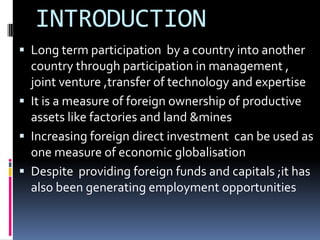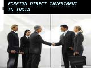 This document discusses foreign direct investment (FDI) in India. It outlines the sectors that permit various levels of FDI, from 100% FDI allowed in hotels and tourism to 26% allowed in insurance and 49% in banking. FDI provides benefits like increased employment and technology transfer but also risks like foreign company dominance. The Indian government's policies aim to attract more FDI through automatic approval routes and investment boards while restricting sectors like gambling. Overall FDI is presented as important for India's economic growth and development.