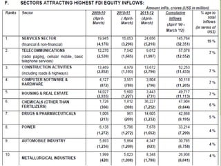This document presents information on foreign direct investment (FDI) in India, with a focus on the pharmaceutical industry. It defines key terms like globalization, FDI, and portfolio investment. It describes the classification, objectives, advantages, and disadvantages of FDI. It provides data on FDI trends in India over time and top source countries. It also summarizes India's FDI policy and regulations, and analyzes FDI in the pharmaceutical industry specifically, including a SWOT analysis. The conclusion discusses the mostly positive impacts of FDI in India while noting some challenges remain.
