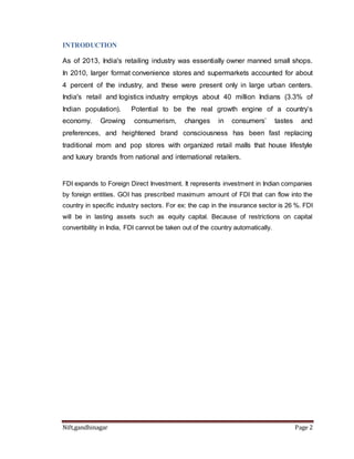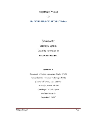 This document provides an introduction and proposal for a minor project on foreign direct investment (FDI) in multi-brand retail in India. It outlines the background and debate around allowing FDI in multi-brand retail. The objectives are to examine growth and future scenarios of FDI in India and study its importance in the current retail sector. Research questions are posed around the role, benefits, and impacts of FDI on small retailers, farmers, and food inflation. Secondary data sources will be used to conduct an exploratory, descriptive, and analytical study of the multi-brand retail sector and driving forces behind FDI.