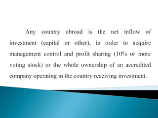 FDI refers to direct investment into production in another country through means such as buying an existing company or expanding operations. It provides benefits like access to new markets and technology but also risks like loss of control and effects on the local environment. While there are debates around its impacts, most experts argue that FDI offers more opportunities than disadvantages for India's economy and growth.
