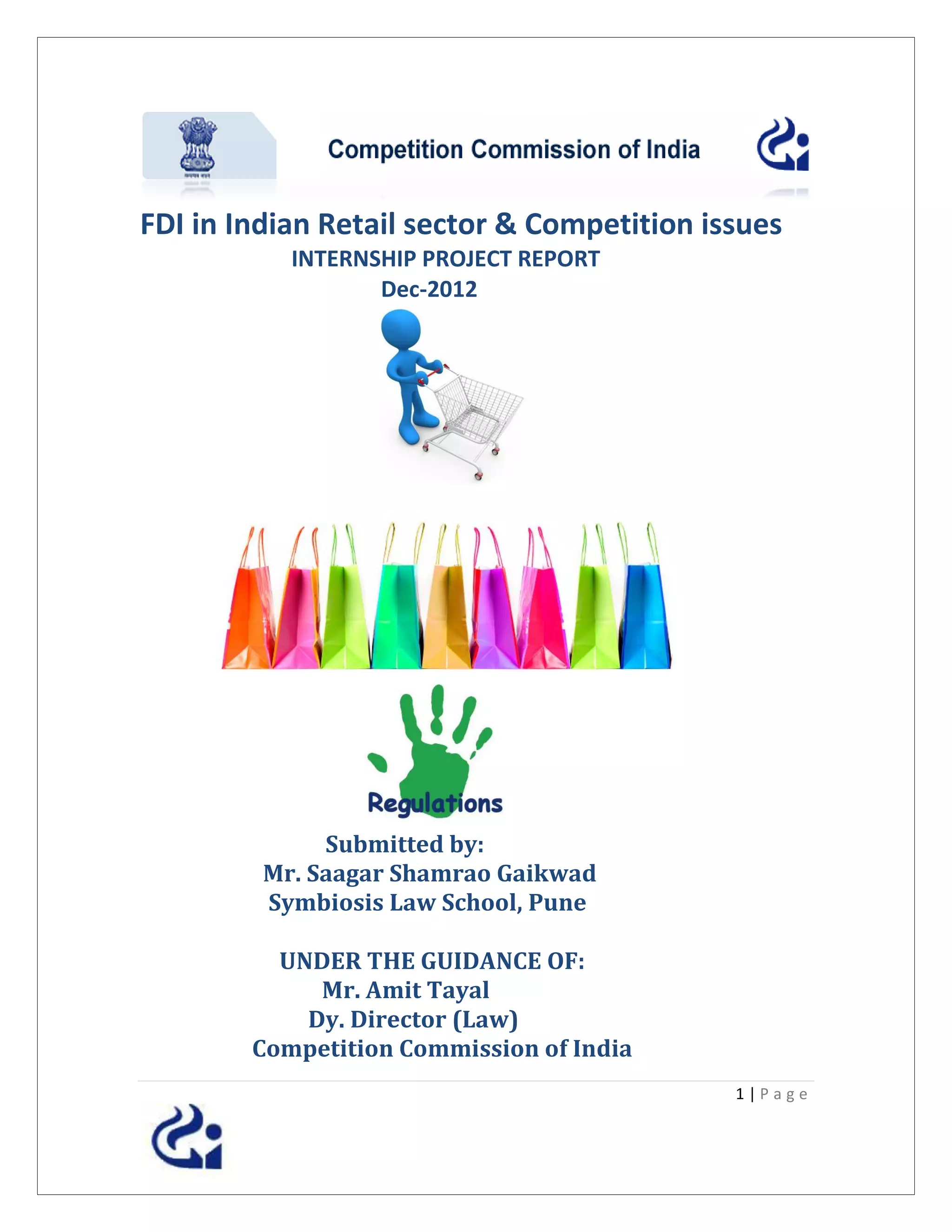 The document provides an overview of FDI in the Indian retail sector and competition issues. It discusses India's history with FDI, the retail sector in India, debates around allowing FDI in retail, the current FDI policy, potential advantages and disadvantages, and global case studies. Experts both support and oppose FDI in retail due to concerns around its impact on small retailers and farmers. The policy aims to balance opportunities and risks by imposing conditions on foreign retailers.