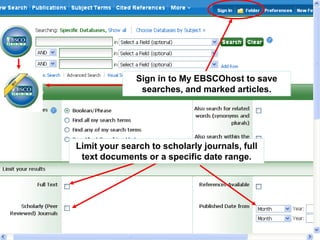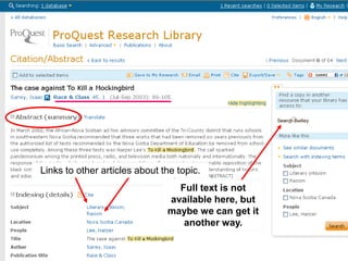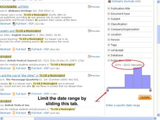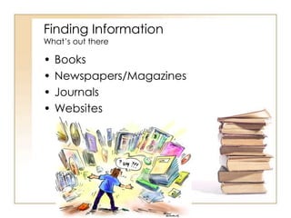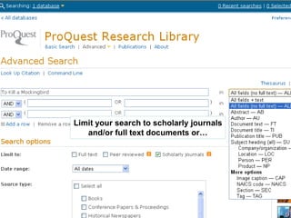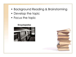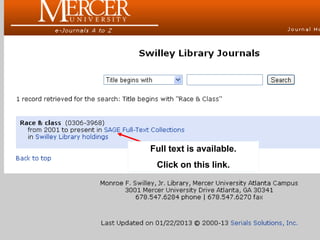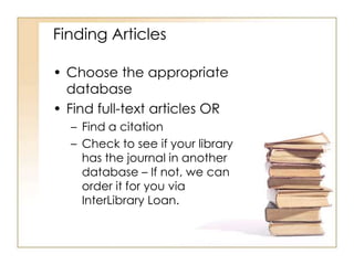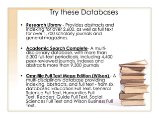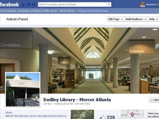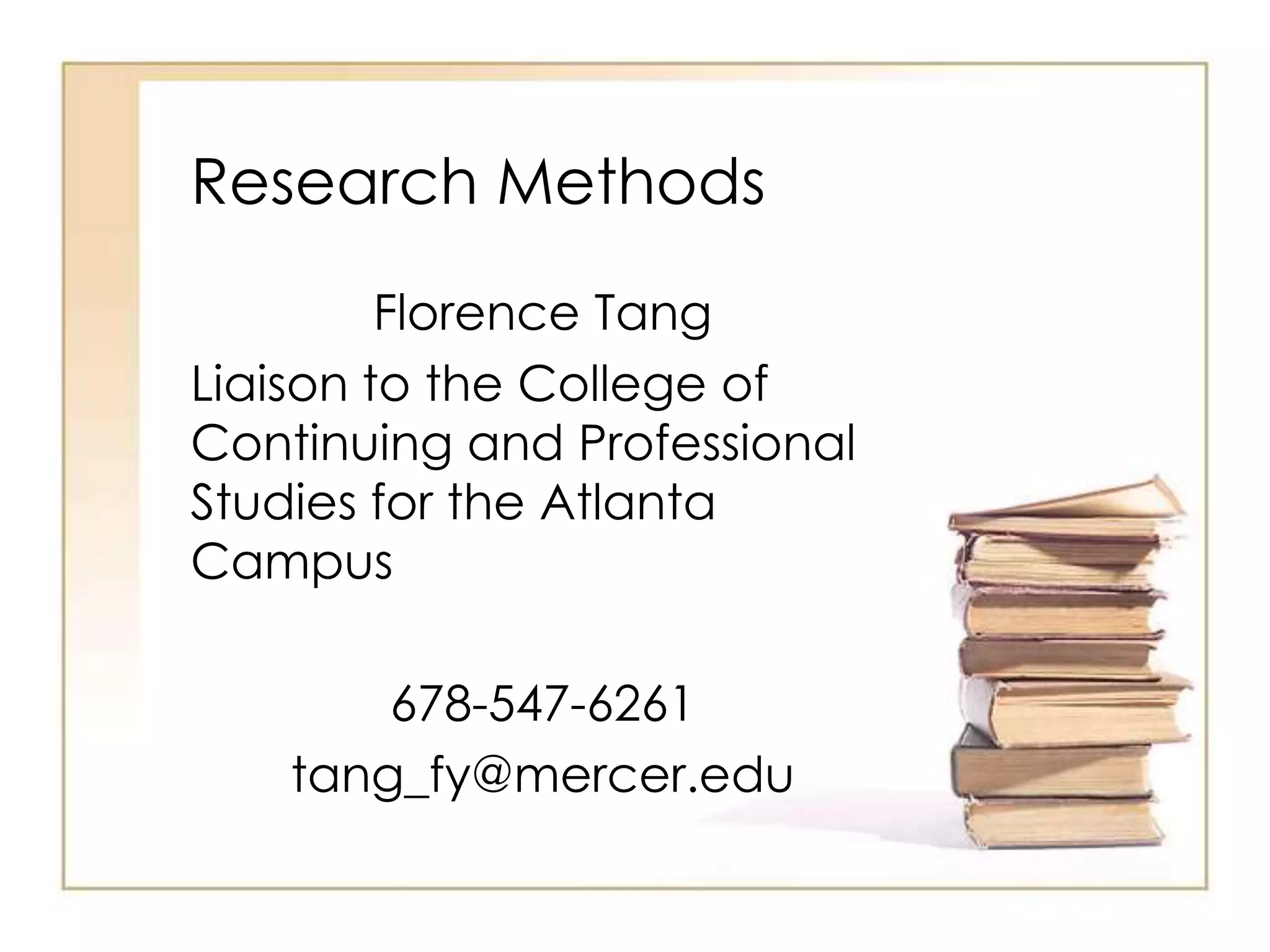 This document provides information and resources for research methods at Mercer University. It introduces Florence Tang as the liaison librarian for the College of Continuing and Professional Studies. It then defines reference librarians and their role in helping students find information. The document outlines steps for background research and developing a topic. It discusses finding books using the library catalog and finding articles using databases. It provides tips for evaluating different sources of information like scholarly journals, popular magazines, and websites. Finally, it discusses interlibrary loan, citing sources, and getting tutoring help.
