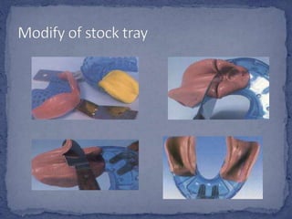 This document discusses various methods and factors related to making impressions for removable partial dentures with distal extensions. It defines different impression materials and techniques, including primary and secondary impressions. Factors that influence support from distal extension bases include the quality of ridges, bone type, denture design, tissue coverage, occlusal forces, anatomy, and fit of the denture base. Techniques discussed for impressions include McLean's, Hindle's, selective tissue placement, and the altered cast method.
