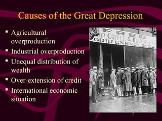 Franklin D. Roosevelt and the New Deal redefined democracy by providing political rights as well as economic security and social justice. The Great Depression was caused by agricultural and industrial overproduction, unequal wealth distribution, overextended credit, and international economic factors. Herbert Hoover's ineffective response as president led to FDR's landslide election in 1932 on a platform of bold action. The New Deal had three main goals - relief for the unemployed, recovery of the economy, and reform of the financial system. It established major programs and agencies that helped rehabilitate the country physically and socially while also strengthening the presidency and democratic system.