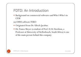 1. The document discusses the Finite Difference Time Domain (FDTD) method for computational electromagnetics (CEM). FDTD solves Maxwell's equations by approximating the derivatives with central finite differences and marching the solution in both space and time.