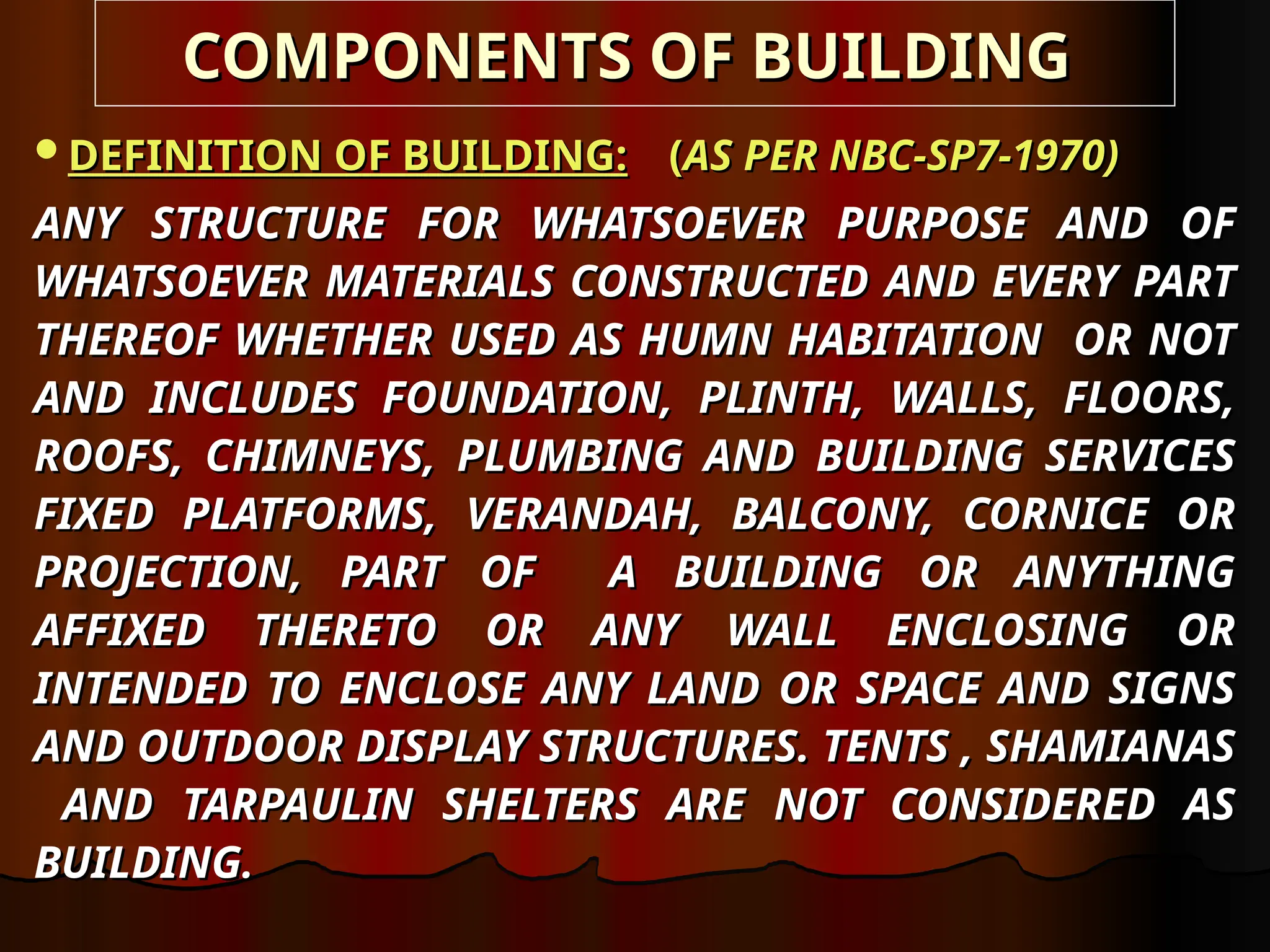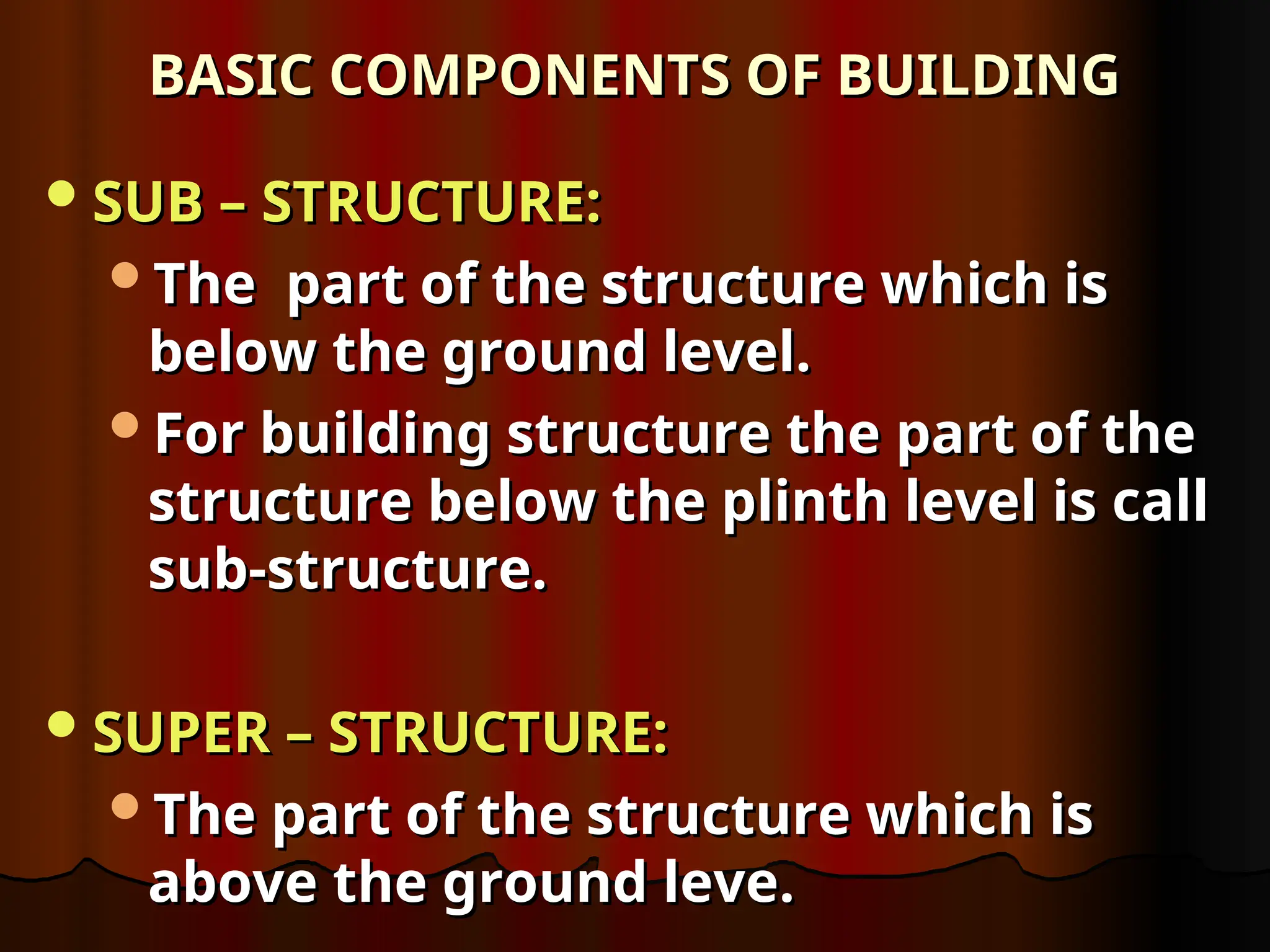 The document outlines the components and functions of buildings, detailing both sub-structure and super-structure elements as defined by the NBC-SP7-1970 standards. Key components include foundations, walls, floors, and roofs, along with their respective functions, such as load transfer and stability. It also discusses soil types, bearing capacity, and methods for determining soil suitability for building foundations.