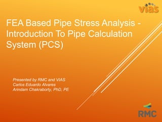 This document provides an overview of pipe stress analysis using the Pipe Calculation System (PCS). It begins with introductions of VIAS and RMC, which develop and support PCS. Standard flexibility analysis methods and their limitations are discussed. PCS is then introduced as an FEA-based alternative. The document demonstrates PCS through examples and a demo. Contact information is provided for questions.