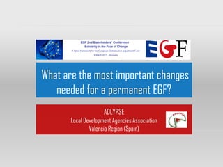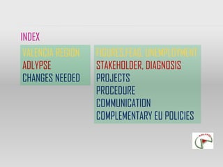 The document discusses the Valencia region economy, unemployment figures, and stakeholders involved in local development. It analyzes economic data from January 2011 and calls for complementarity with EU policies like flexsecurity, lifelong learning, and dissemination of information networks.