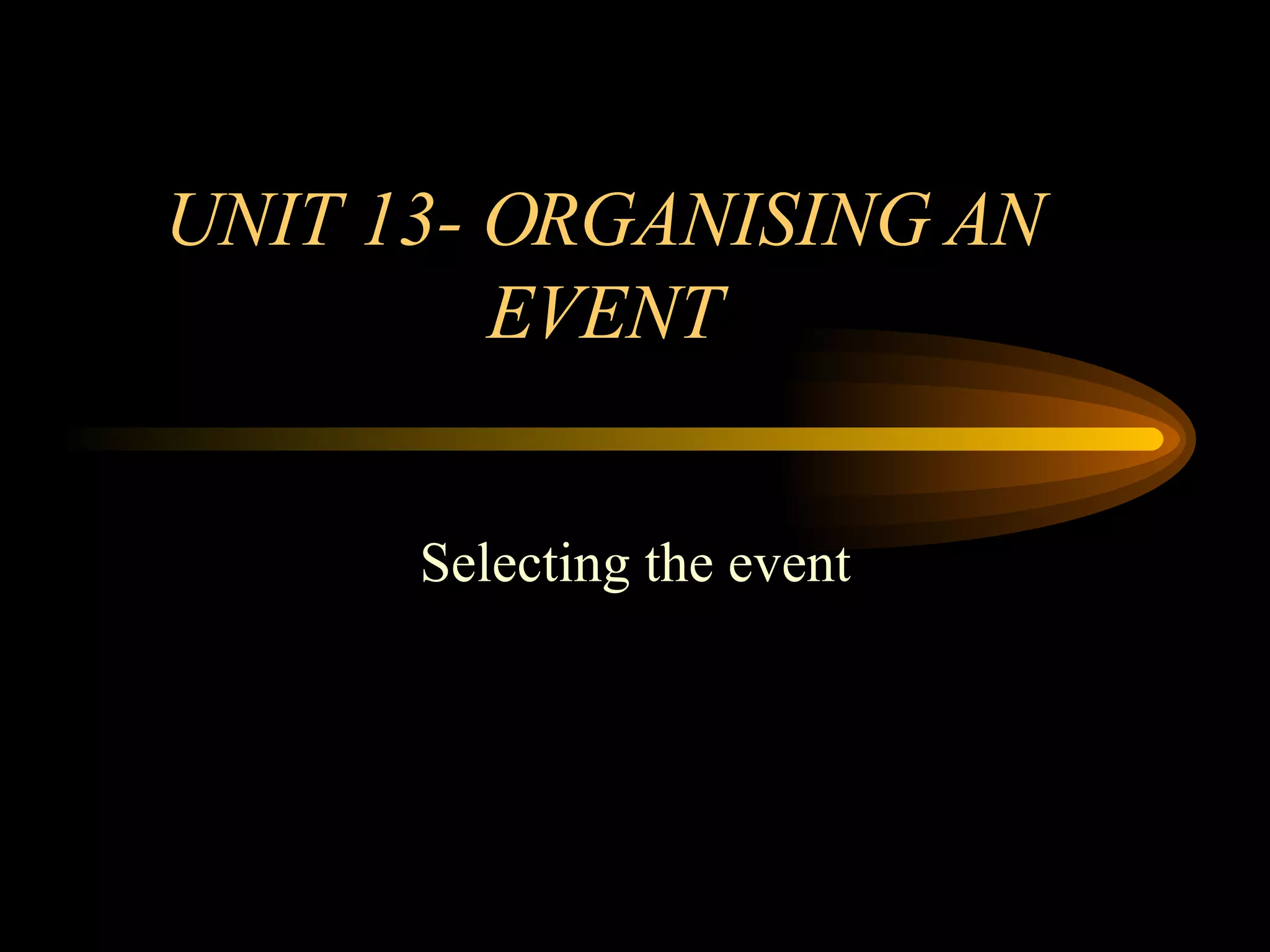 1. The document discusses organizing an event and provides guidance on selecting an event idea, defining the purpose and goals, and conducting research on feasibility.