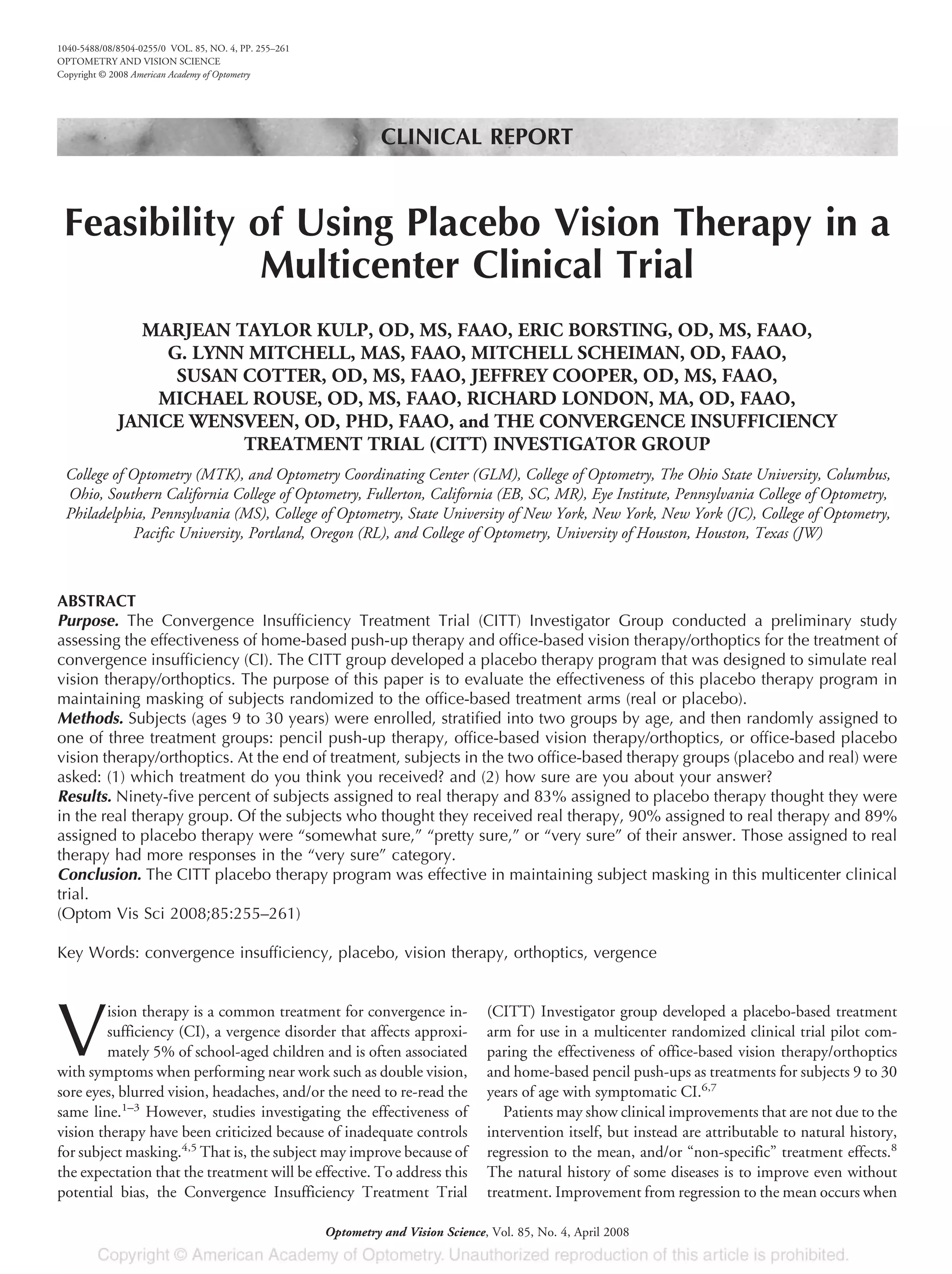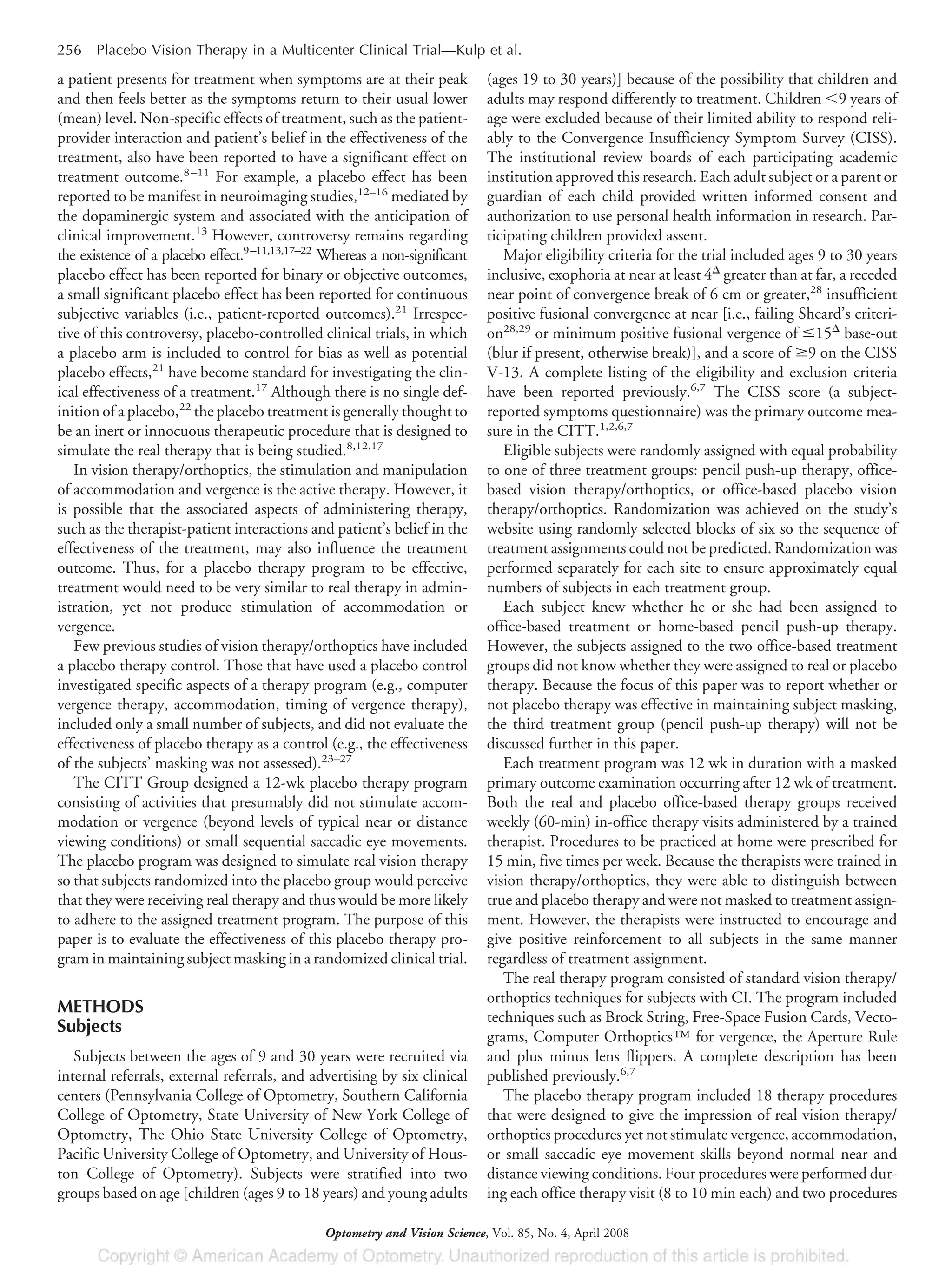 This document summarizes a study that evaluated the effectiveness of a placebo therapy program designed for a clinical trial on convergence insufficiency. The study developed a placebo therapy program intended to simulate real vision therapy/orthoptics without actually stimulating accommodation or vergence. At the end of the 12-week treatment period, subjects were asked which treatment they thought they received and how sure they were of their answer. Ninety-five percent of subjects receiving real therapy and 83% receiving placebo therapy thought they received real therapy. The majority of subjects in both groups were somewhat, pretty, or very sure of their answer. The study concluded that the placebo therapy program was effective in maintaining subject masking in this clinical trial.