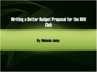 The document outlines a plan to write a better budget proposal for the BUV Club in order to secure more funding. It identifies poorly written past proposals that resulted in insufficient funds and proposes creating new budget proposal templates. It lists the audience for the proposal, criteria that must be addressed, potential research methods, topics to investigate like funding board requirements, and questions to address.