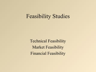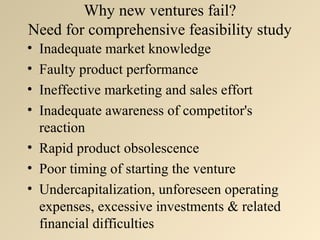 The document discusses the importance of conducting comprehensive feasibility studies for new ventures. It outlines three key areas of feasibility studies: technical feasibility, market feasibility, and financial feasibility. Technical feasibility involves product testing and development. Market feasibility requires identifying the target market and demand. Financial feasibility involves determining funding needs, costs, cash flow, and return on investment. Comprehensive feasibility studies across all three areas are necessary to avoid common reasons why new ventures fail such as inadequate market knowledge, ineffective marketing, or undercapitalization.