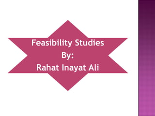 The document discusses the purpose and process of conducting a feasibility study for a potential business project. A feasibility study examines the operational, technical, and economic viability of an idea by analyzing factors such as costs, profits, and cash flows. The study should provide decision-makers with quality information to help determine if a project is worth funding and pursuing further. The document outlines the key components of a feasibility study, including collecting primary and secondary data, estimating capital and operating expenses, projecting revenues and profits, and assessing risks and limitations.