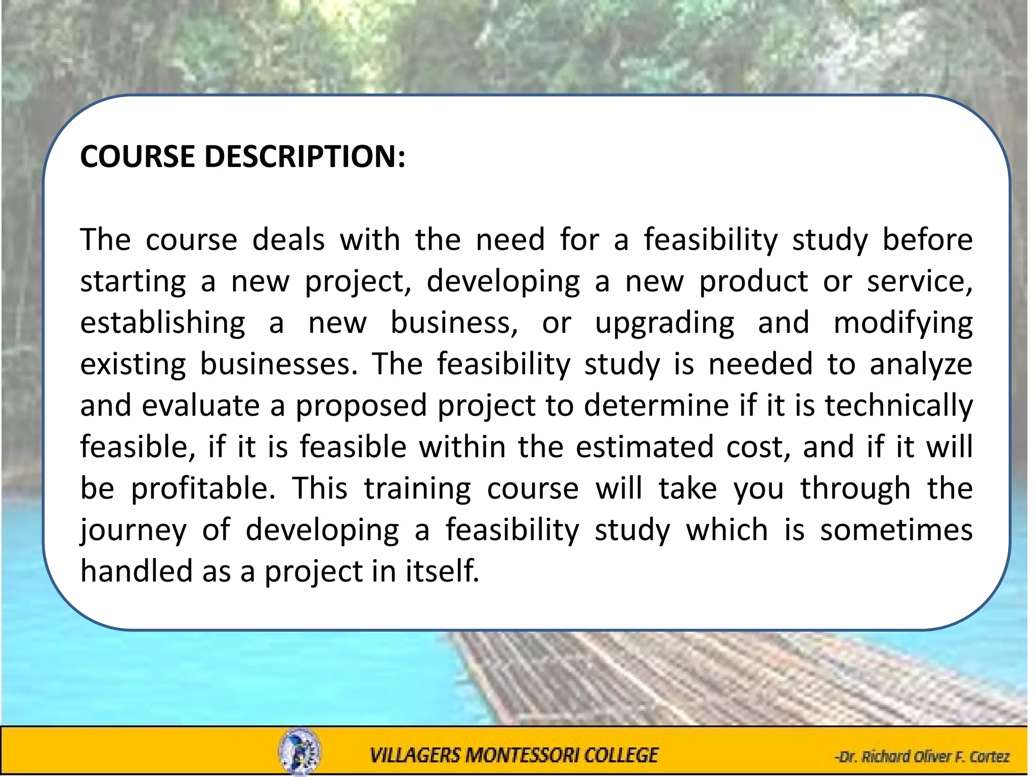 This course covers conducting feasibility studies for new projects, products, services, or businesses. A feasibility study analyzes and evaluates a proposed initiative to determine if it is technically and financially viable. The course teaches how to prepare feasibility studies, identify key arguments, and present ideas convincingly. Students will learn to build financial models in Excel, perform scenario and sensitivity analysis, and analyze other feasibility studies. Topics include defining feasibility studies, their uses and challenges, and the steps to develop one, including assessing strategic context, economic analysis, commercial and financial considerations, and management approach.