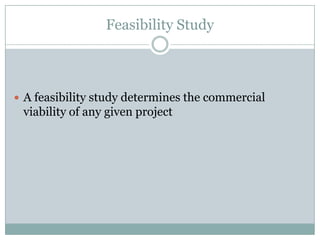 This document outlines the components and process of conducting a feasibility study. It discusses that a feasibility study determines the viability of a project by analyzing key factors such as the plan, costs, funding sources, personnel needs, market potential, and profitability. The study involves researching these components, analyzing the collected data, and formulating conclusions on whether the project is feasible to pursue. If deemed feasible, the study recommends proceeding to develop a full business plan.