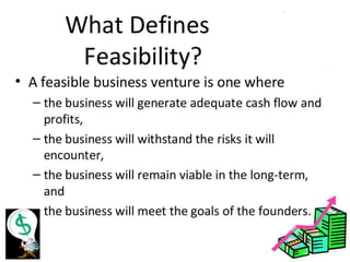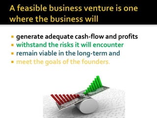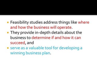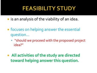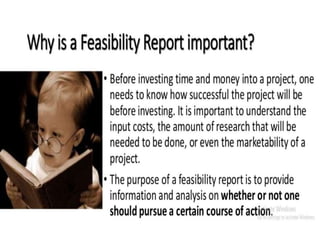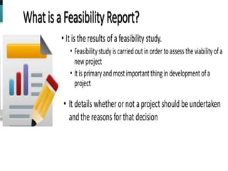 This document outlines the contents and preparation of a feasibility study report. It discusses the 10 guidelines advocated by UNIDO for feasibility studies, including the scope of the project, cost structure, operations scheduling, and contingencies. It also provides a 10-point checklist for feasibility reports, covering topics like examining public policy, specifying outputs and production techniques, conducting market analysis, specifying raw materials, site selection, layout preparation, and estimating working capital needs. The document serves as an introduction to conducting feasibility studies and preparing feasibility reports.