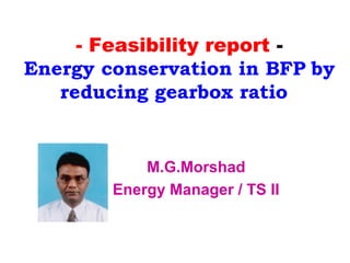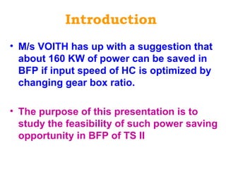 This document analyzes the feasibility of saving energy in a boiler feed pump (BFP) system by reducing the gearbox ratio. It finds that reducing the ratio from 1:3.57 to 1:3.4 could save 147 kW per BFP on average. For two BFPs, this would amount to annual savings of 1.81 million kWh in energy or 1809 tons in lignite. The simple payback period for modifying the two BFP gearboxes is estimated to be 4.15 years. Further investigation is needed to check if vibration or operational issues could arise from the gearbox ratio change and how quickly the original setup could be restored if problems occur.