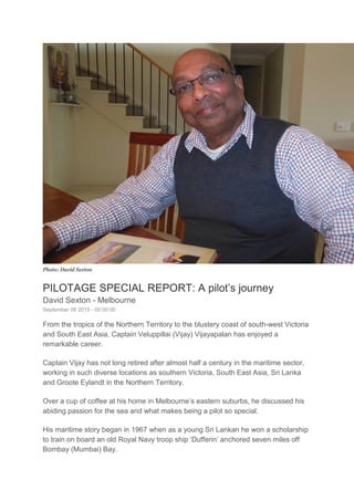 Captain Vijay Vijayapalan had a remarkable 50-year career working as a pilot across diverse locations including southern Victoria, South East Asia, Sri Lanka, and Groote Eylandt in the Northern Territory. He discussed his passion for the sea and what makes being a pilot special, noting the importance of cultural sensitivity, gaining crew confidence, and putting safety before commercial pressures. As a pilot, he faced challenges like limited maneuvering space in Portland and increasing ship sizes, and took satisfaction in training new pilots.