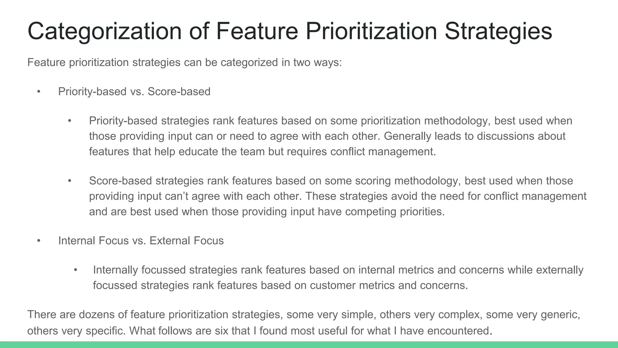 Feature prioritization strategies can be categorized as either priority-based or score-based. Priority-based strategies explicitly rank features, while score-based strategies assign numerical scores to features. Strategies can also be categorized based on their internal or external focus. Some common strategies include Feature Bucketization, which categorizes features based on business goals; MoSCoW, which classifies features as "Must have", "Should have", etc.; and Story Mapping, which orders features across multiple releases.