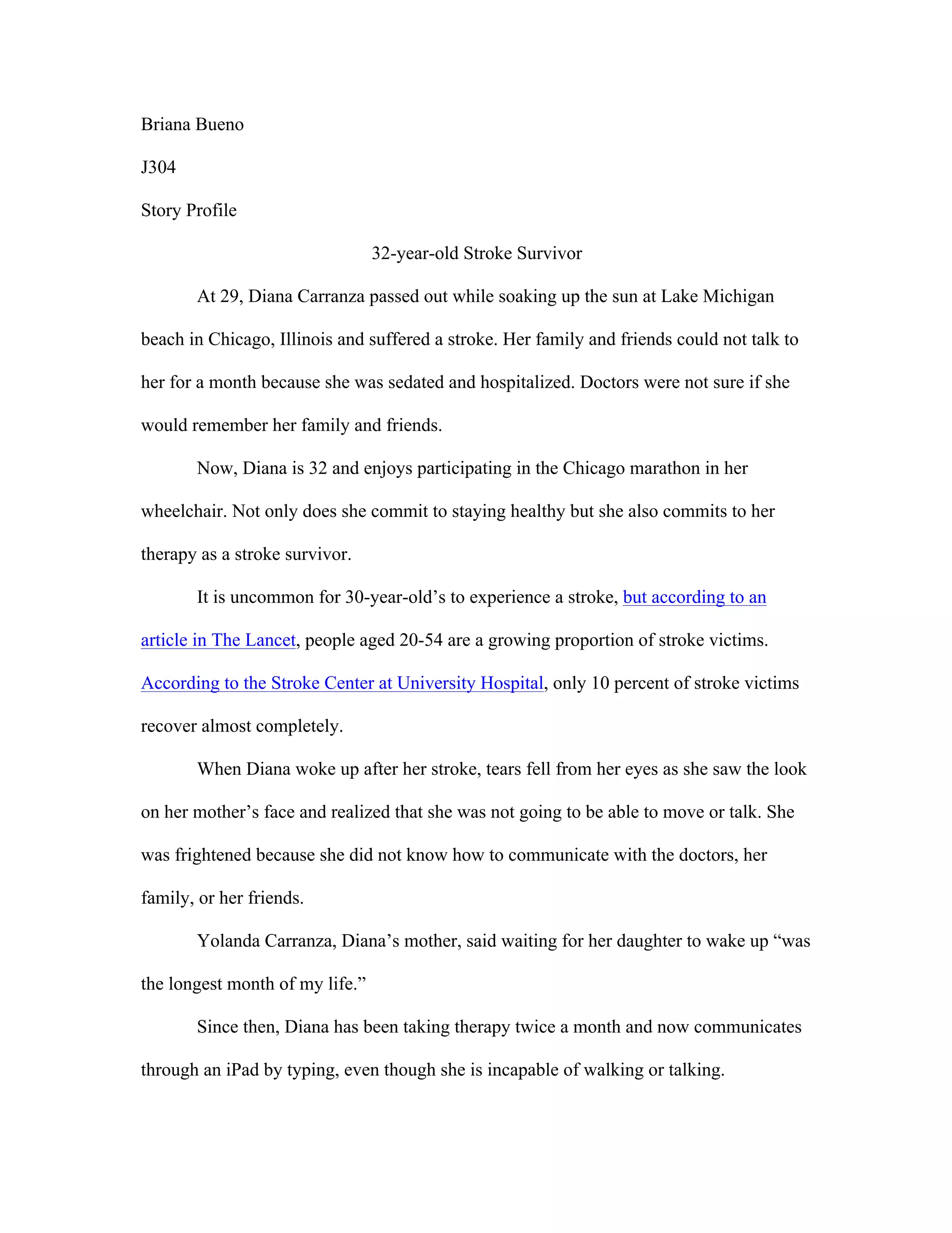 Diana Carranza suffered a stroke at age 29 while at the beach in Chicago. She was hospitalized for a month and doctors were unsure if she would recover. Although she is now unable to walk or talk, Diana participates in marathons in her wheelchair and has physical therapy twice a month. Before her stroke, Diana had run several marathons but now relies on friends and family to help her complete marathons and with daily activities like eating. Racing continues to be an important part of Diana's recovery process and emotional well-being.