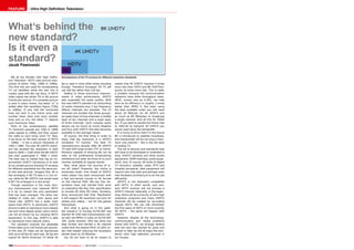 Ultra high definition television (UHDTV) provides significantly higher resolution than HDTV through two standards - 4K UHDTV which doubles the resolution of HDTV, and 8K UHDTV which quadruples the resolution. UHDTV also improves on HDTV by allowing wider color gamuts and higher frame rates up to 120 frames per second. However, UHDTV requires much greater bandwidth for transmission and most current infrastructure and devices are not compatible with UHDTV standards. While the technology and standards are still in development, UHDTV is expected to eventually become mainstream as the new standard for television.