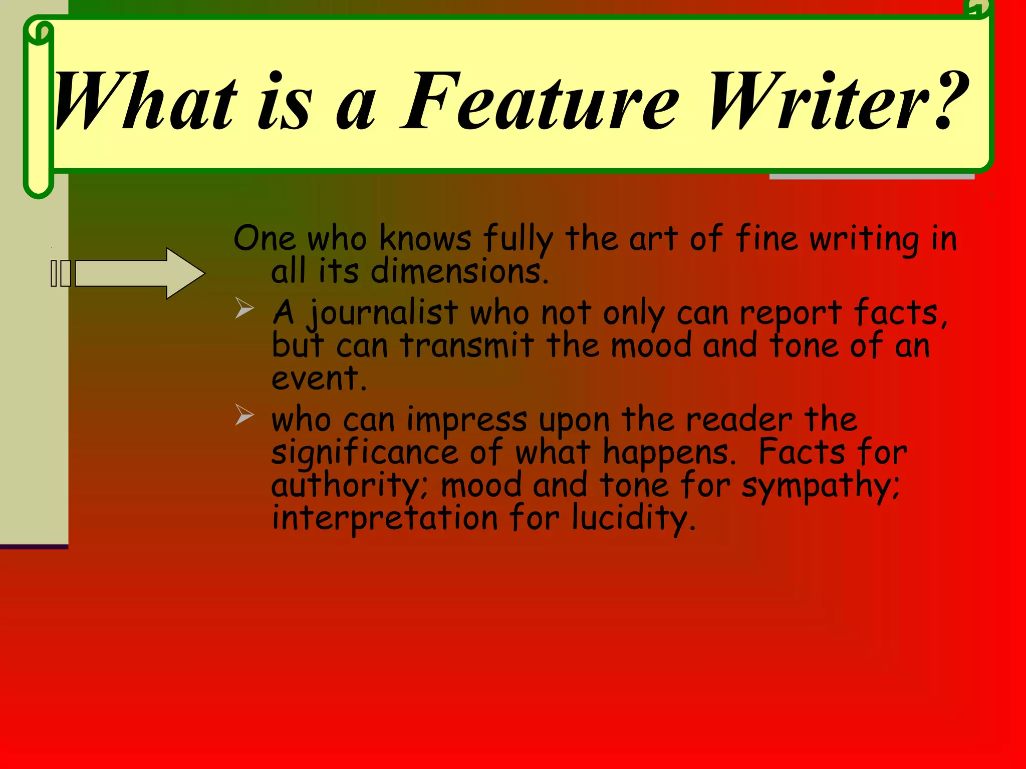 This document provides information about feature writing, including the key elements and styles of feature stories. It defines what a feature writer and feature story are, and discusses the main differences between features and standard news stories. The document also outlines the main components of a feature story, including the lead, body, and conclusion. It provides examples of different types of feature stories and offers tips on writing techniques, such as using descriptive language, quotes, anecdotes and other devices to engage readers. Additionally, it provides guidance on developing the structure, flow, and tone of a compelling feature story.