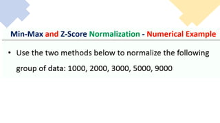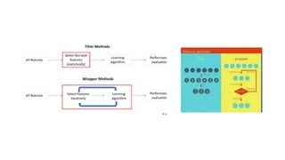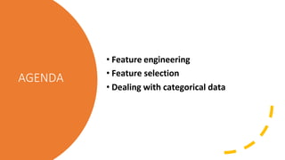 The document outlines key concepts in feature engineering, including feature scaling techniques such as normalization and standardization, and emphasizes the importance of feature selection for improving model performance. Various methods of feature selection are discussed, highlighting the need to remove irrelevant features for better accuracy and efficiency. Additionally, it covers techniques for encoding categorical data and evaluating classification and regression models using various metrics.
