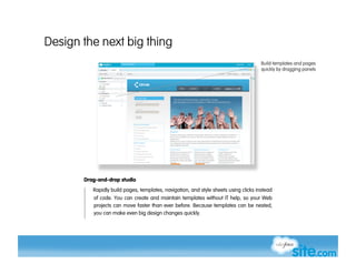 Site.com allows users to rapidly build websites using a drag-and-drop interface without needing coding skills. It provides integrated hosting, caching, and a database to publish websites and integrate data without worrying about servers. The platform also includes a private social network to enable real-time collaboration on projects and documents.