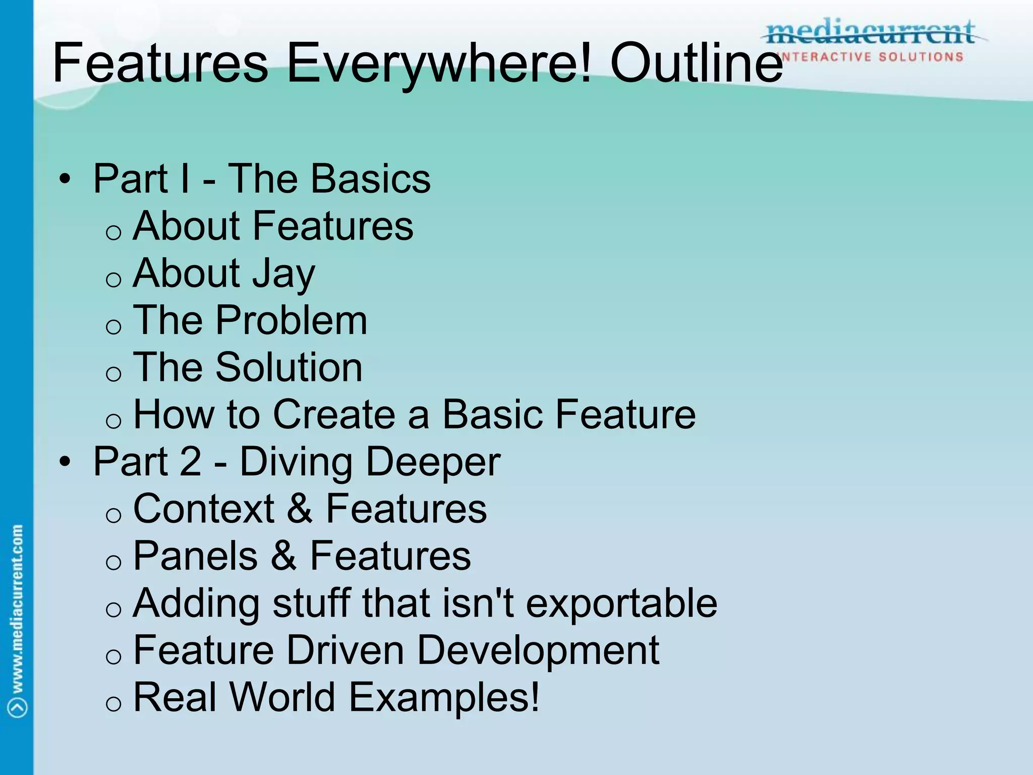 This document provides an overview of feature driven development in Drupal. It discusses how features allow encapsulation of items like views, content types, and configurations to make deployment and version control easier. It provides instructions for creating basic features and exporting non-exportable items. Feature driven development is presented as creating a feature module for each content type along with related components. Examples of real world feature lists are shown to demonstrate how features are used to package common site elements.