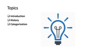 This document discusses multimedia and provides an overview of key topics. It defines multimedia as content that uses a combination of different media types like text, audio, images, video and interactive content. The history of multimedia is explored, noting how newspapers were early adopters of multiple media elements. Multimedia is then categorized as either linear or non-linear, with linear following a set sequence and non-linear allowing free movement. Features of multimedia like text, audio, images, video and animation are described. The document also outlines applications of multimedia in areas like commercial, entertainment, education and engineering. It concludes by discussing the future potential of multimedia.