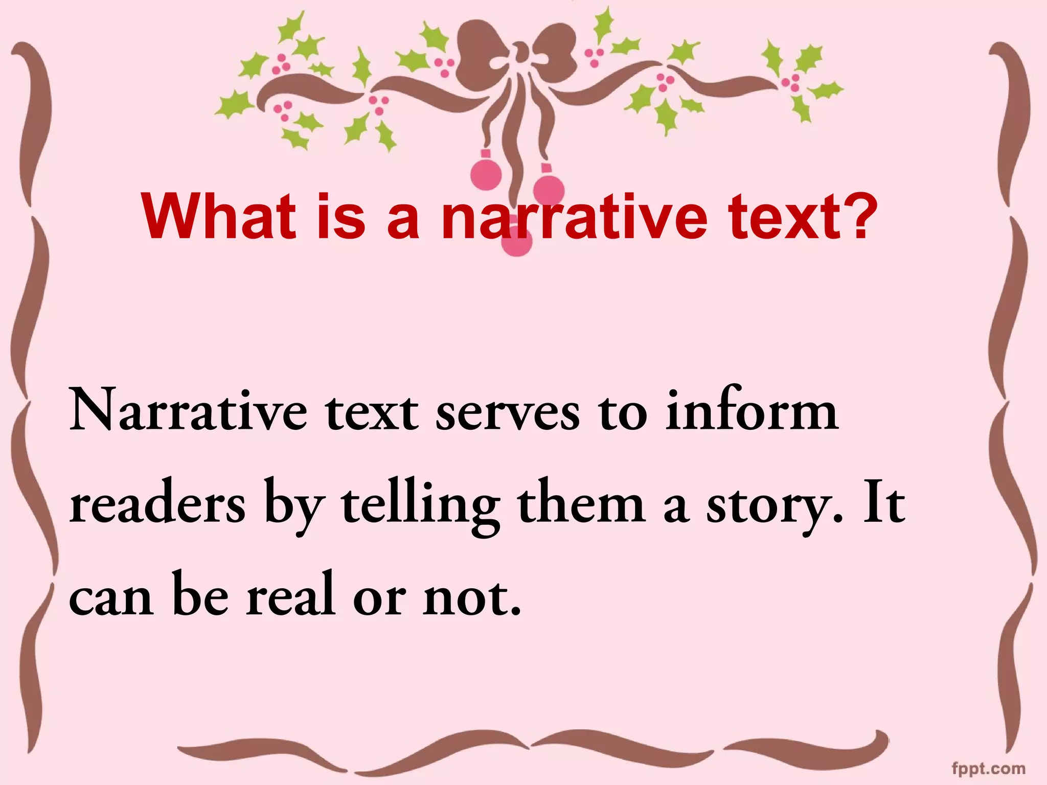 A narrative text tells a story to inform readers. It has a beginning, middle, and end with characters and a setting. Common examples of narrative texts include plays, novels, short stories, and picture books. Narrative texts have characteristics like progression of events, characters like protagonists and antagonists, conflicts between people or with nature, and a lesson.