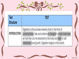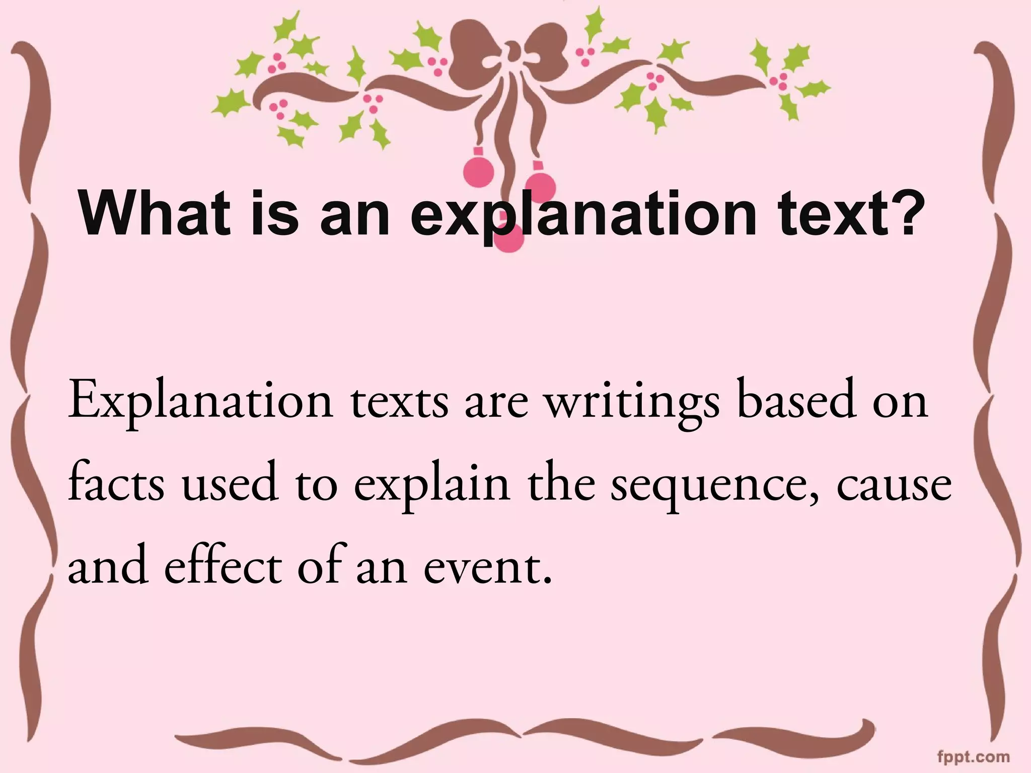 Explanation texts are factual writings designed to clarify how things work and why events occur, addressing 'how' and 'why' questions. They can be sequential, causal, or consequential, and include structured elements such as clear titles, grouped ideas in paragraphs, and the use of specific signal words. Common topics include the life cycle of animals, the process of digestion, and the causes of natural events like tsunamis.