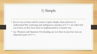 Java was created to bring portability and security to computer languages. It has several key features, including being simple, object-oriented, and robust with error checking. Java is also platform independent, as code compiles to bytecode that can run on any machine with a Java Runtime Environment. It is secure with virus and tamper protection, supports multithreading, is architecture neutral, portable between platforms, and can provide high performance. Java also enables distribution of programs across a network.