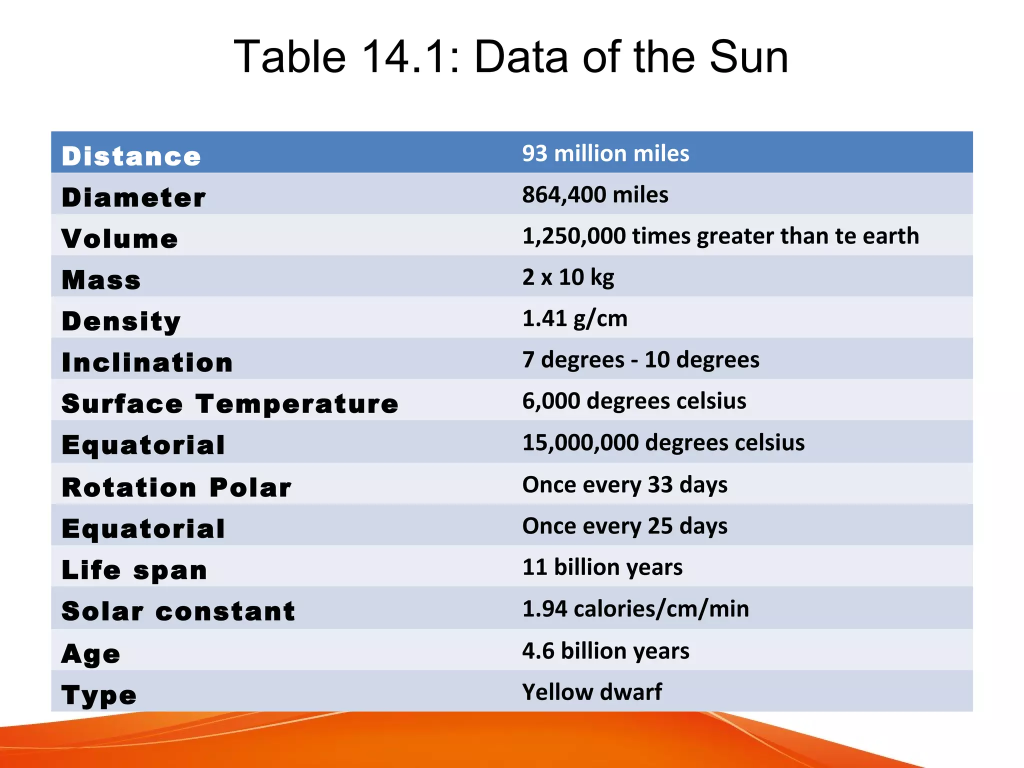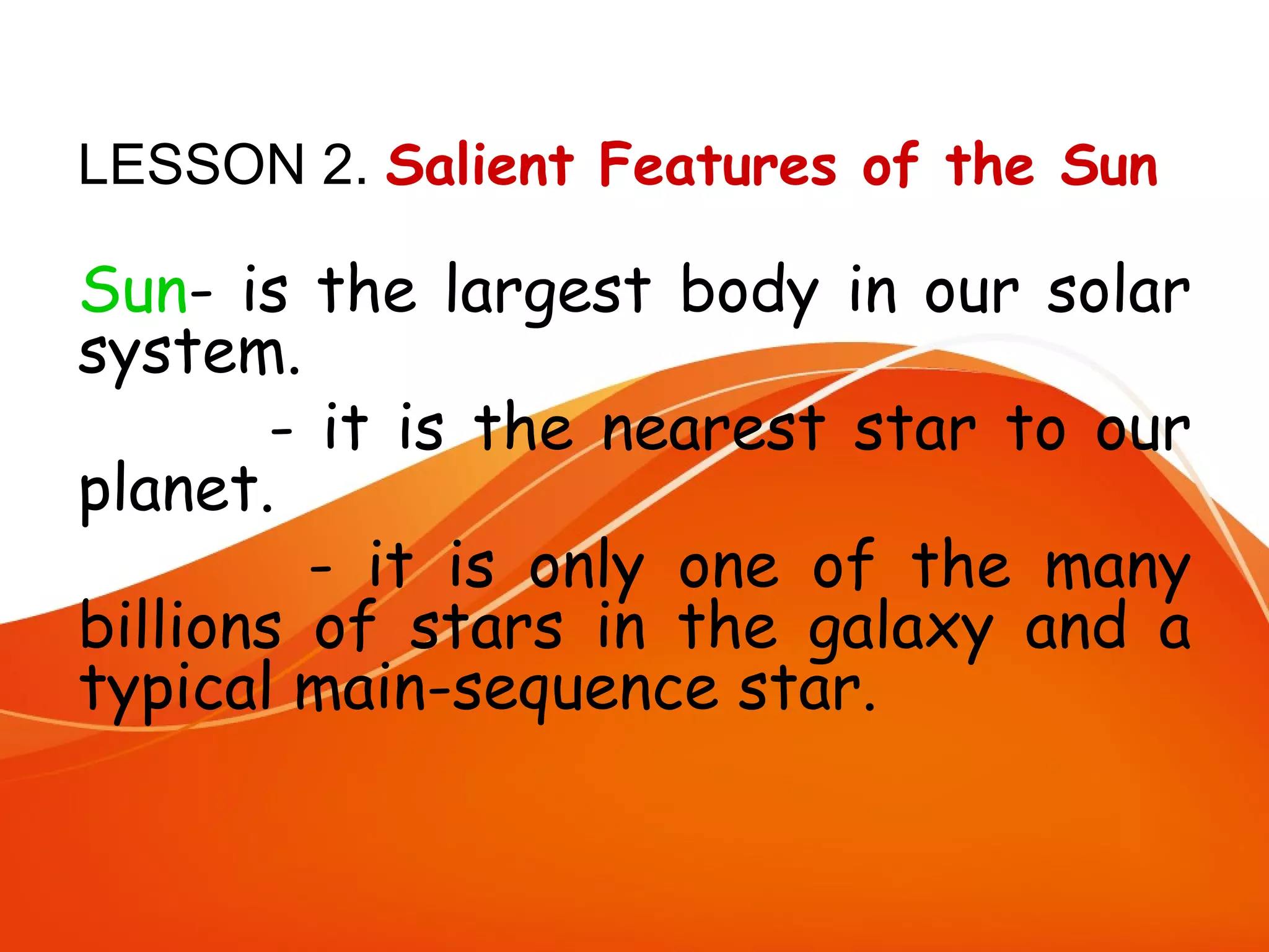 The document provides information about the sun and solar system. It describes the key layers of the sun's atmosphere, including the photosphere, chromosphere, and corona. It also classifies and compares the eight planets based on their size, composition, distance from the sun, rotation, and other characteristics. Additionally, it discusses asteroids, comets, and meteors, noting that asteroids reside in the belt between Mars and Jupiter, while comets have elliptical orbits and meteors appear as streaks of light in the night sky.