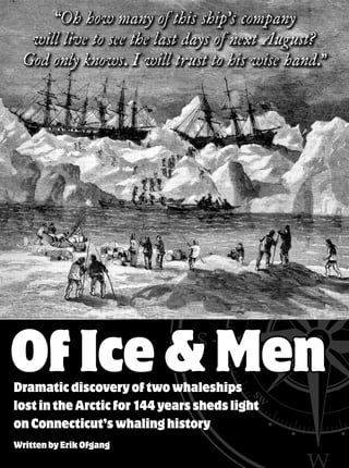 This document summarizes the discovery of two whaling ships that were lost in the Arctic 144 years ago. An archaeological team led by NOAA used advanced mapping technology to discover the wrecks of the whaleships Monticello and J.D. Thompson, which were part of a larger fleet of 33 ships trapped by ice off Alaska in 1871. This discovery sheds new light on Connecticut's historical whaling industry and the largest whaling disaster in U.S. history. The document provides historical context on whaling and details William Williams' first-hand account of the events as a 12-year old crew member aboard the Monticello.