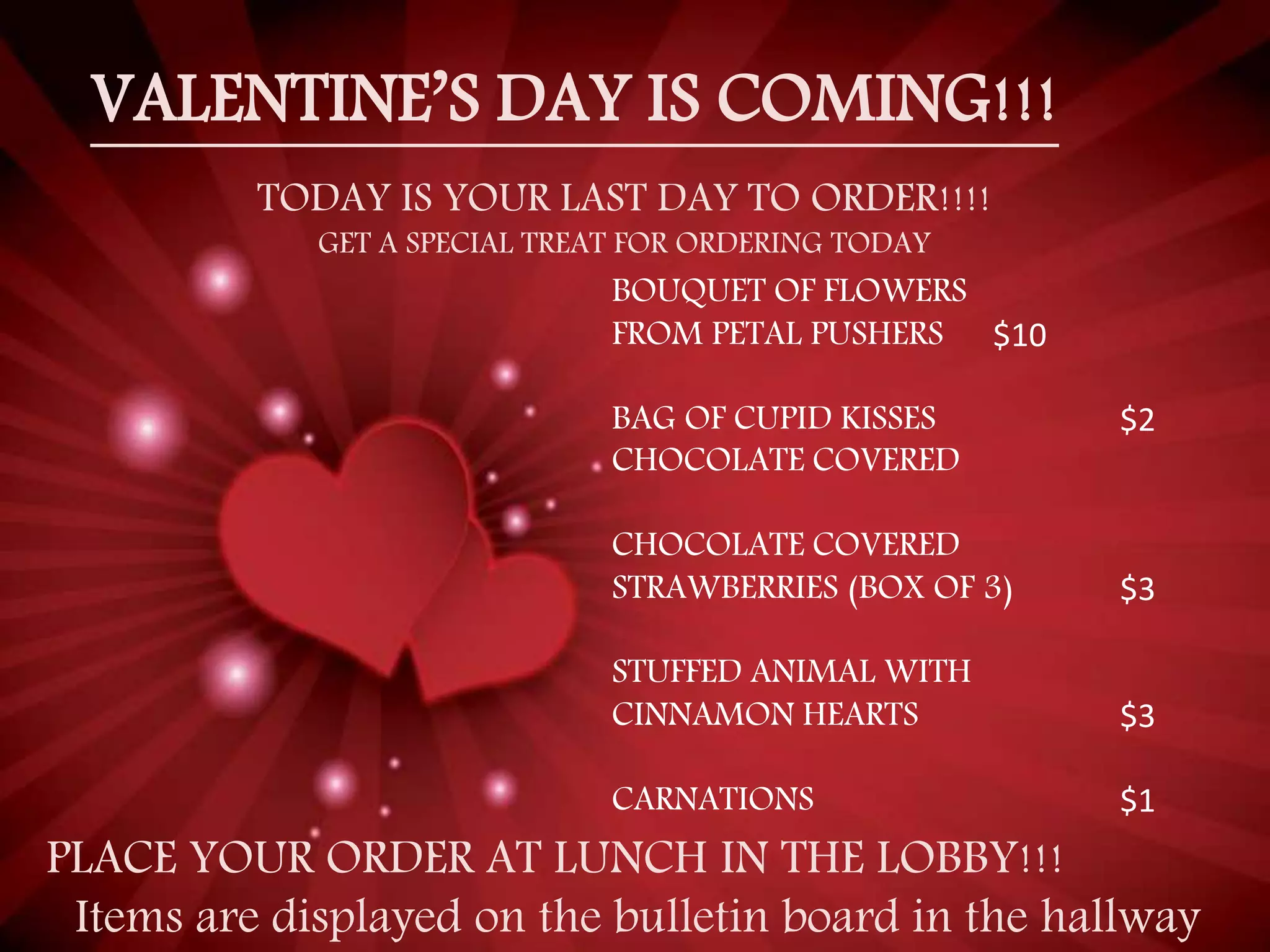 This document contains announcements for a school regarding Valentine's Day orders and activities, sports team results, club meetings, food specials, and more. Key details include: Valentine's items like flowers and chocolate are available to order by lunch today; the Alpine ski team had great performances with several in the top 10; signups are open for a new badminton season; and an outdoor skate event is happening on Monday with free food.