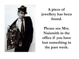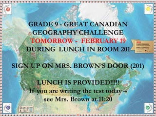 This document contains announcements for students and staff of a high school. It announces the following events: a Canadian geography challenge test on February 19; a lost piece of jewelry in the office; bringing lunch to the library this Friday; badminton practice on Tuesdays and Thursdays; boys traveling for a game on February 23; lunch specials; needing junior girls volleyball uniforms; free books in the library; a science day on February 25 with various activities; a math contest on February 24; travel opportunities in March and summer presented on February 19; important junior boys hockey meeting today; athletic council meeting today; girls soccer tryout information; a library group meeting; a student council meeting; an OSAP presentation on March