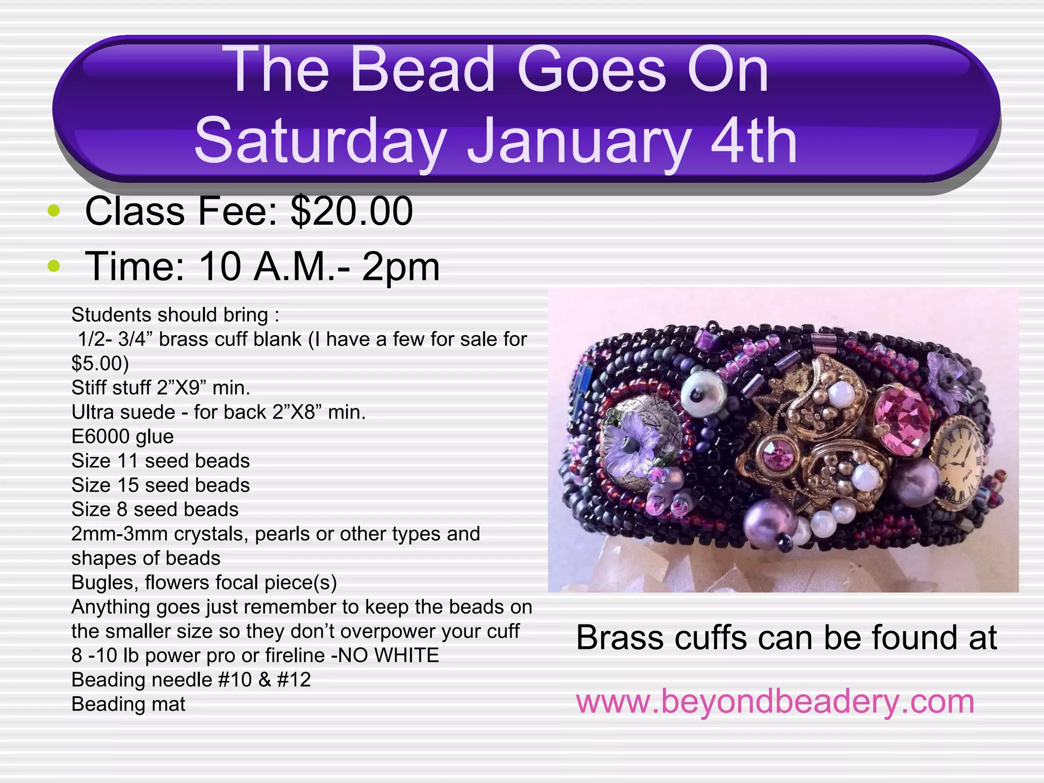 The document contains details about several upcoming beading and jewelry making classes, including the class title, date, time, fees, and required materials. The first class on January 4th is for making a beaded cuff and costs $20, with students needing beads, thread, and other cuff-making supplies. The February 5th class is for making puffy heart pendants and costs $20, requiring crystals and flexible polymer clay. The February 12th class focuses on metalworking techniques and costs $45, covering all materials needed to make a fly pendant.