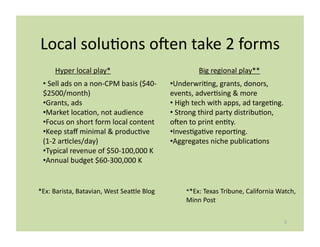 The document discusses the challenges facing American journalism, particularly focusing on revenue losses as traditional media declines and local news deserts emerge. It highlights potential local solutions through both hyper-local and regional approaches to generating revenue, alongside sustainability considerations for new journalism ventures. Key questions are posed for evaluating sustainability and the business models of these projects while referencing the need for innovative strategies and metrics for success.