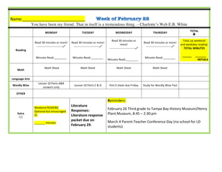 This document appears to be a weekly homework assignment sheet for a student. It lists reading, math, language arts, and other assignments for each day of the week. It reminds the student to read for at least 30 minutes each day and keep track of total minutes read for the week. It also notes that a literature response packet is due on February 29th and lists two upcoming field trips and a parent-teacher conference day.