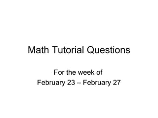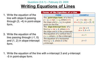 This document provides math tutorial questions and solutions for classifying triangles and writing equations of lines for the week of February 23-27. The questions cover writing equations of lines in point-slope and slope-intercept form, graphing lines, applying lines to word problems, and classifying triangles by angle and side length. The corresponding solutions provide step-by-step work and explanations for each question.