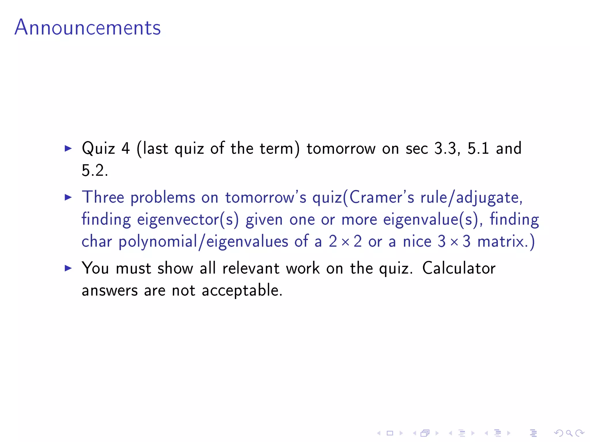 - Quiz 4 will be tomorrow covering sections 3.3, 5.1, and 5.2 of the textbook. It will include 3 problems on Cramer's rule, finding eigenvectors given eigenvalues, and finding characteristic polynomials/eigenvalues of 2x2 and 3x3 matrices. Students must show all work.